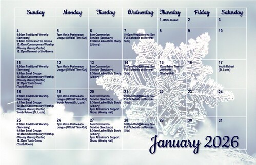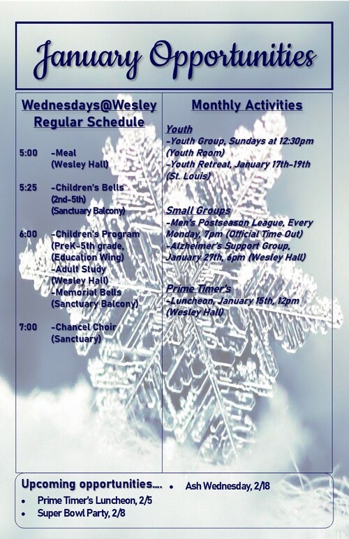 Wednesdays@Wesley (September -April): 5pm (Meal), 6pm (Classes and Bells), 7pm (Choir)