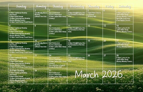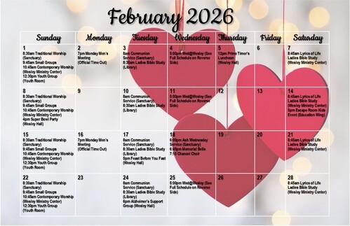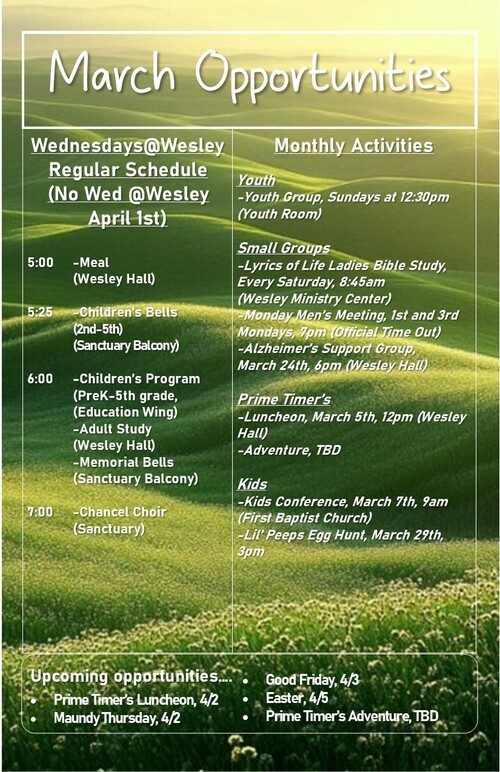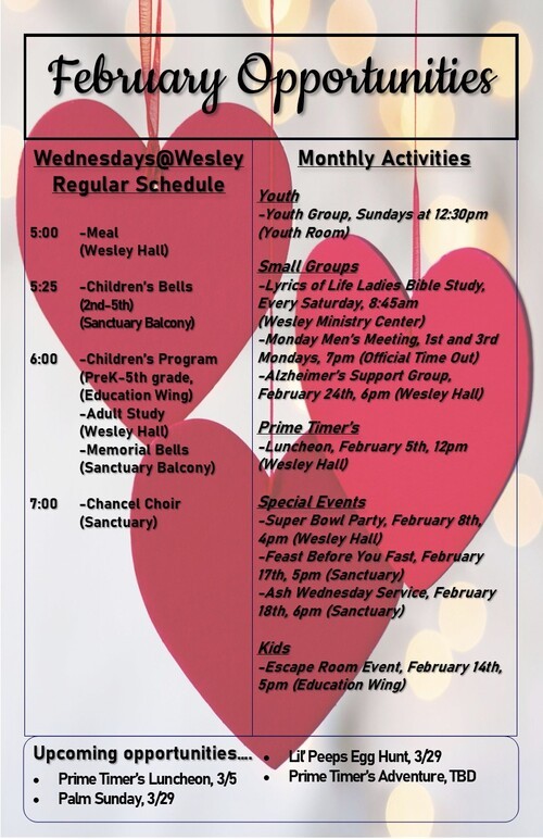 Wednesdays@Wesley (September -April): 5pm (Meal), 6pm (Classes and Bells), 7pm (Choir)