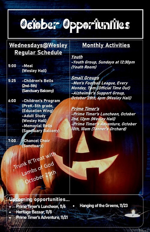 Wednesdays@Wesley (September -April): 5pm (Meal), 6pm (Classes and Bells), 7pm (Choir)